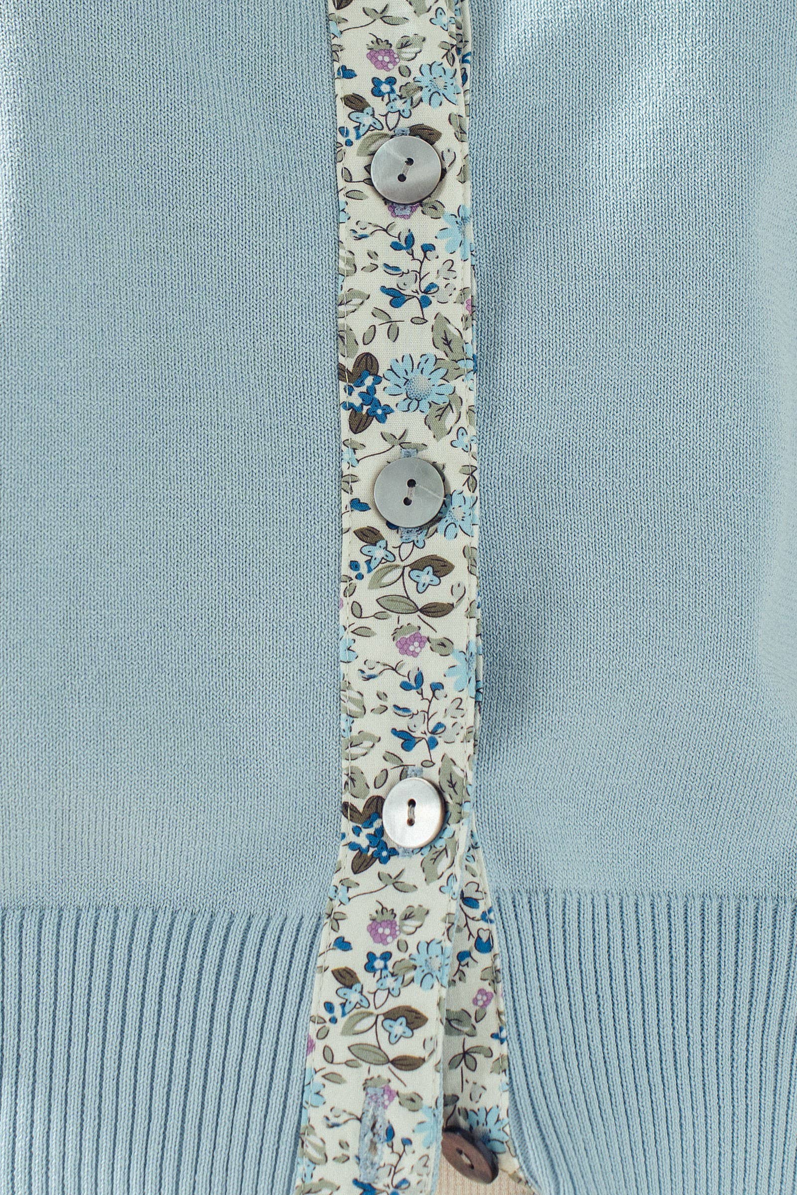 Add a touch of whimsy to your knitwear collection with this charming light blue cardigan. Featuring a unique floral print fabric detail along the button placket, the classic crewneck silhouette offers a soft, comfortable layer perfect for pairing with skirts or denim.