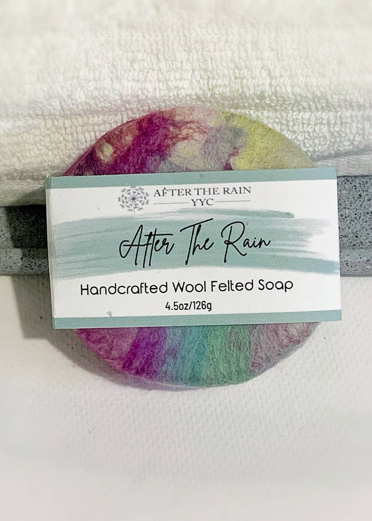 Our soaps are all natural, handmade by us, using the finest ingredients in small batches and felted with very soft merino top roving. We use hand dyed roving for these soaps, so each soap colour will be unique. Felted soap is similar to a soap and a washcloth in one. The wool acts like a gentle exfoliator for your skin. The wool covering helps to extend the life of your bar, enabling you to use every last bit, and makes it easier to grip in the bath or shower. It is also great for helping to increase lather in all natural soaps like ours.