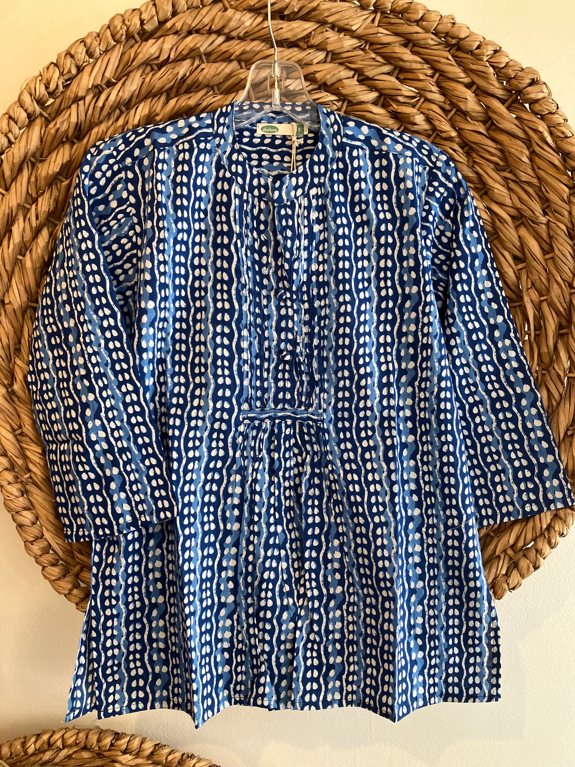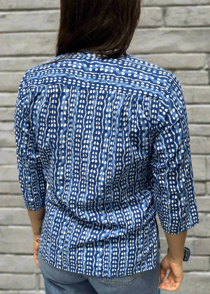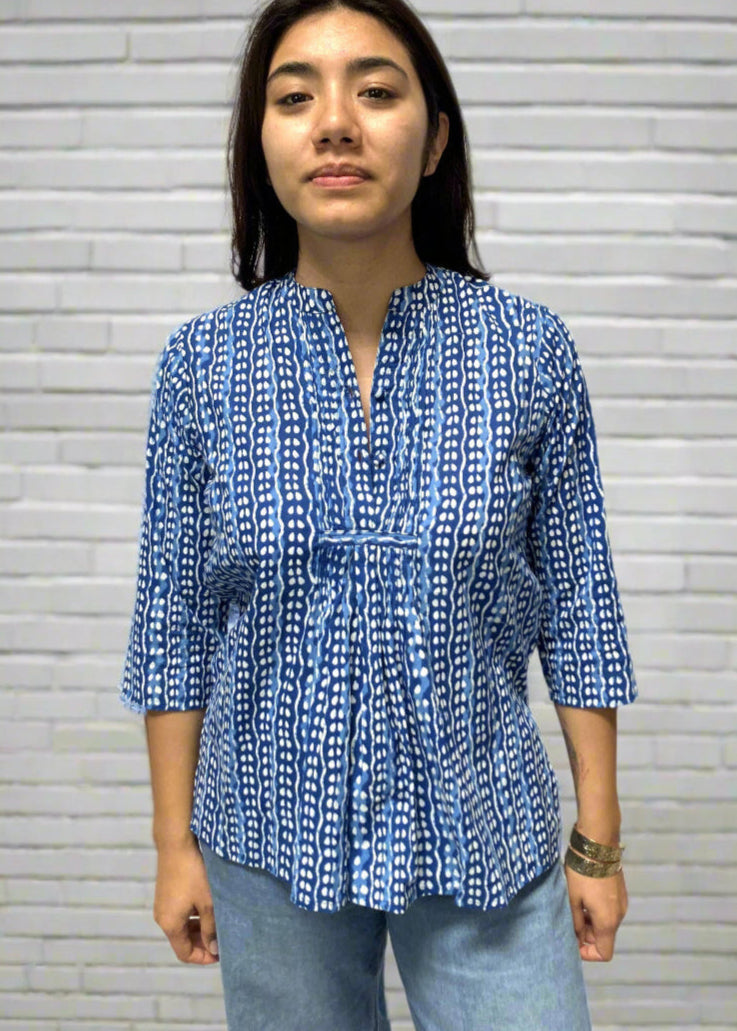 Gathered Front Cotton Top- This top is a structured vneck blouse that is gathered just below the bustline and has 3/4 length sleeves. The rich color of indigo gives it visual depth and a casual feel. Pair this top with your favorite denim.