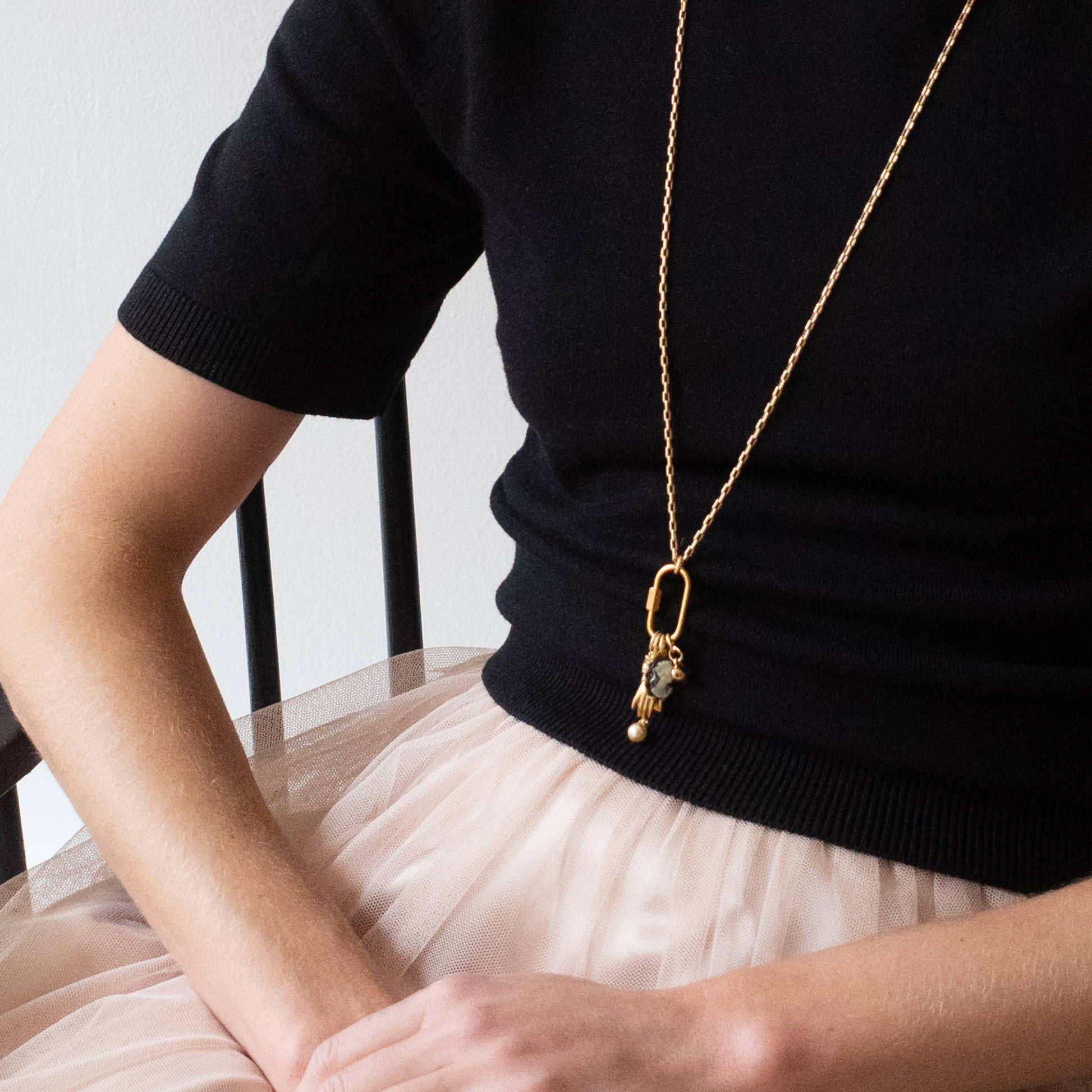 A vintage-inspired paperclip chain charm necklace featuring a cameo, golden fish with a crystal eye, tiny heart, and a graceful hand holding a Swarovski crystal pearl.