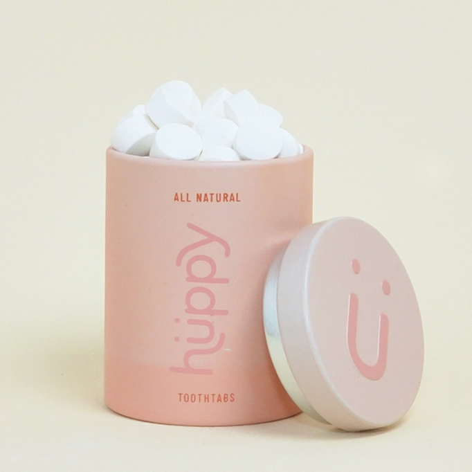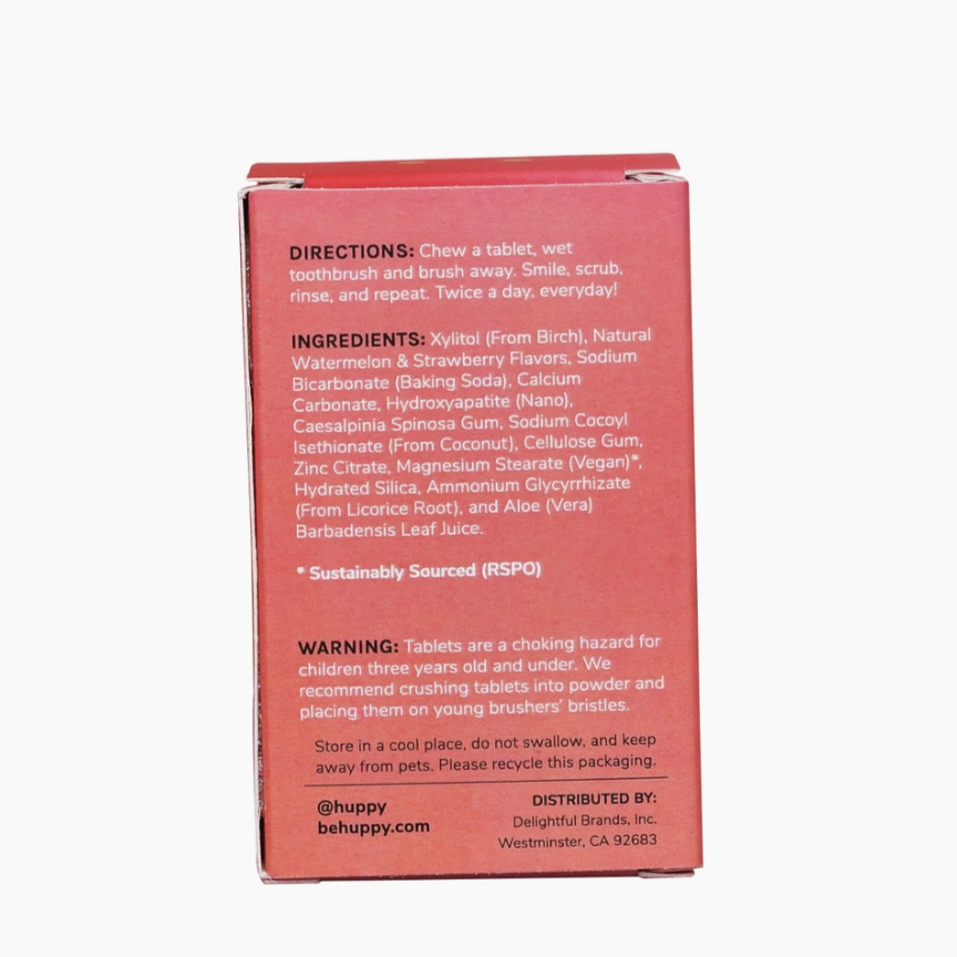 Huppy Toothpaste Tablets made with Watermelon & Strawberry are a toothpaste alternative that are great for kids and adults alike. Our Watermelon Strawberry tablets are made with clean ingredients such as coconut oil, aloe vera extract, and xylitol, while containing no mint. Our tablets also contain nano-hydroxyapatite, a non-toxic fluoride alternative that remineralizes tooth enamel & helps fight sensitivity. Huppy’s Toothpaste Tablets are also vegan, non-GMO, and cruelty-free. Our tablets foam easily and are super easy to use: chew, brush with a wet toothbrush, and rinse. - 62 Tablets - Great for Kids - Aluminum Refillable Blush-Colored Case - Clean Ingredients - Non-Chalky - Satisfying Foam - Plastic-Free - Mess Free