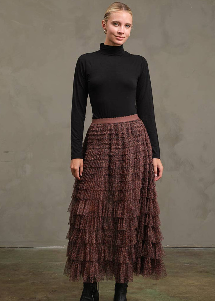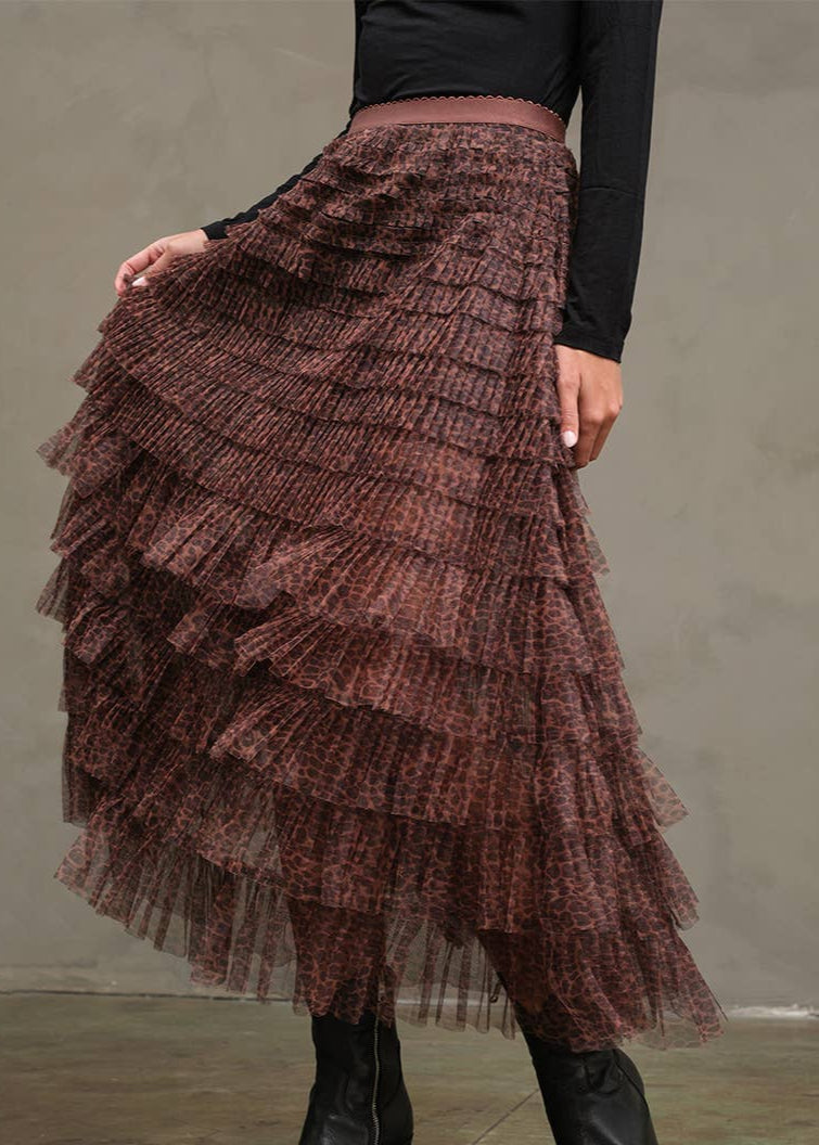 Bring texture and movement to your look with this wild yet elegant tiered mesh skirt. -Allover leopard print on soft mesh fabric -Tiered ruffle layers for dramatic volume -Comfortable elastic waistband -Fully lined for coverage and ease of wear -Pairs perfectly with a fitted top or cozy knit for a chic fall ensemble.