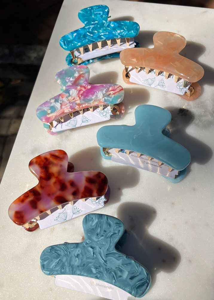 All of our pieces are made from cellulose acetate. A mixture of cotton pulp and acetic acid. It is a biodegradable and eco-friendly material.