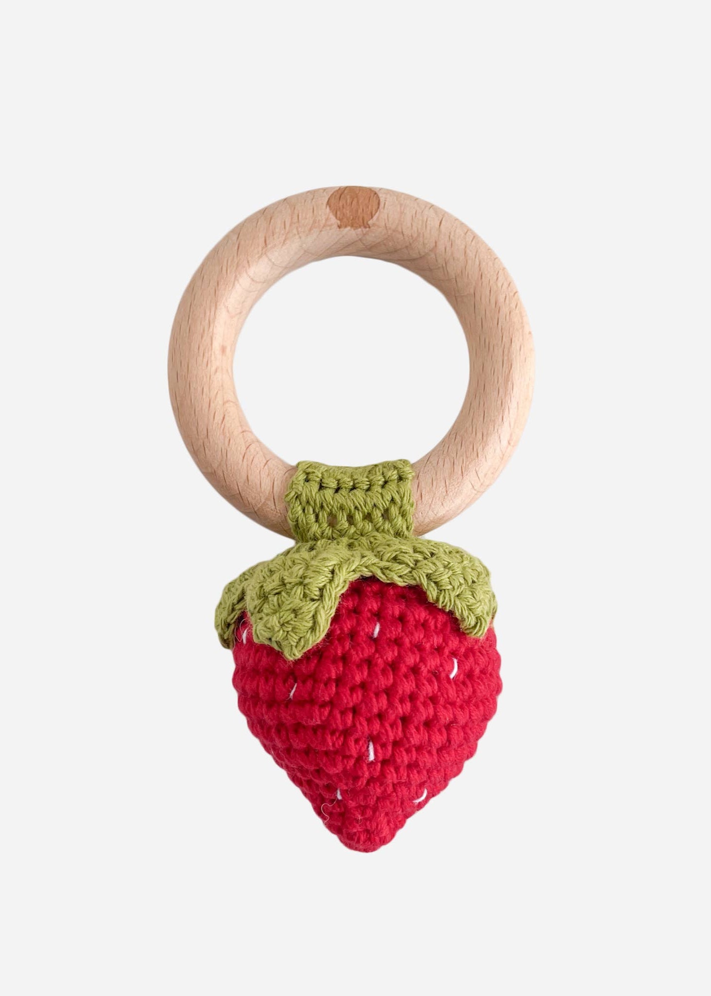 Crafted for tiny hands, this adorable red strawberry teether doubles as a playful rattle, creating a delightful sensory experience. Made from soft cotton and beech wood for safe chewing, it's the perfect blend of fun and functionality. Pair with a blanket or hat for a complete gift set. Also available in other colors. Shop all our teethers to find the perfect one.