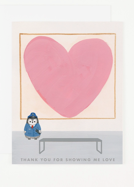 Penguin museum guard in front of a heart painting text reads "Thank You for Showing me Love"