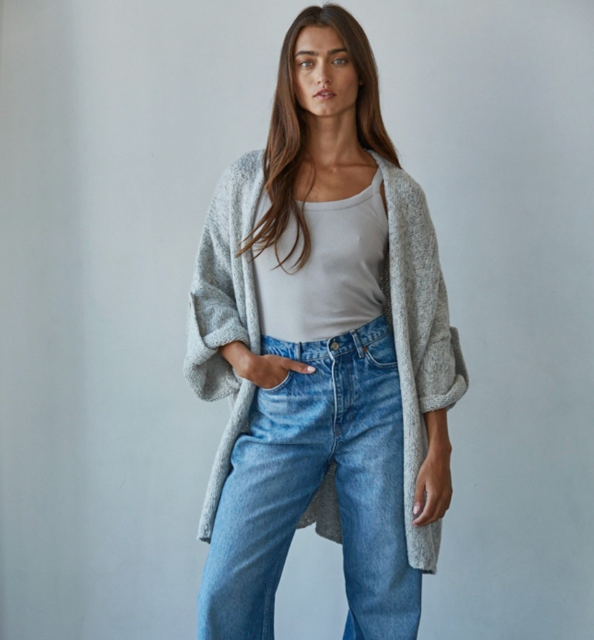 Heather gray open cardigan with button sleeve detail. No notes...