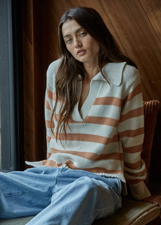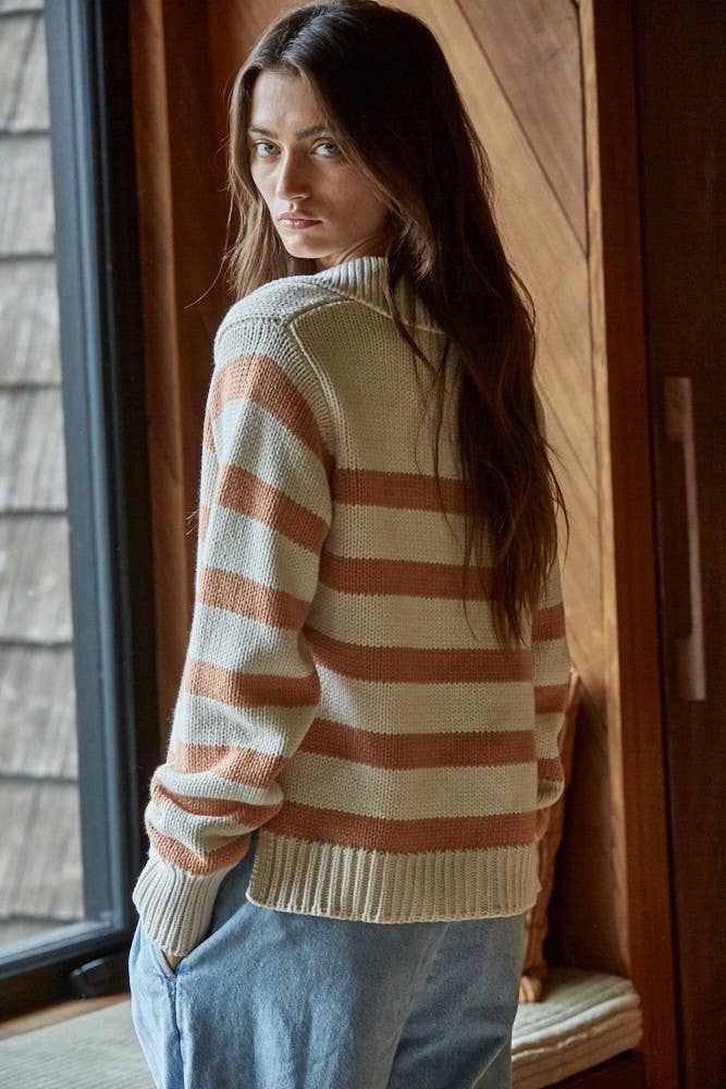 Knit Sweater Striped Cotton Acrylic Striped V-Neck Collar Long Sleeve Top With Side Slits