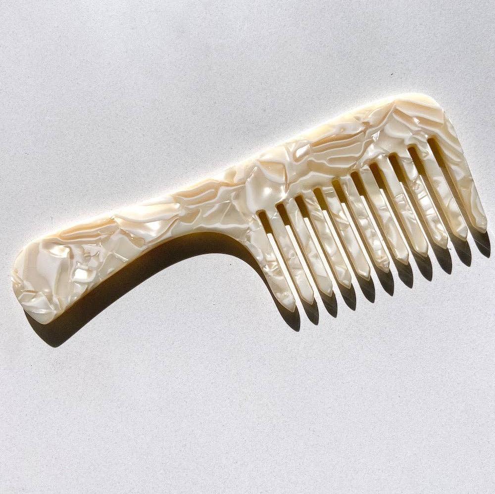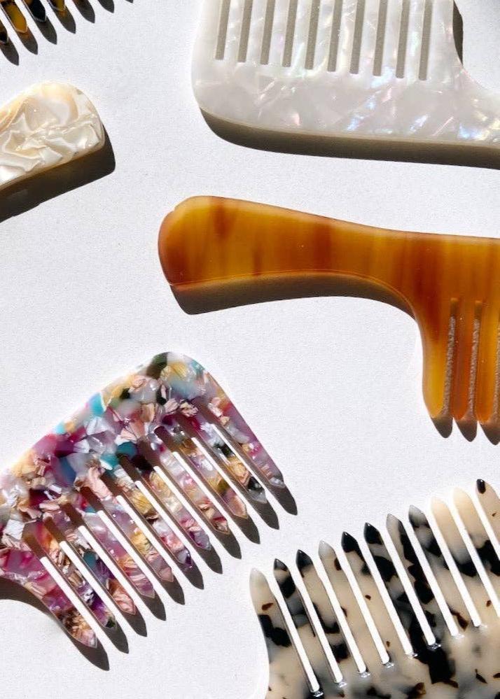 Each hair comb is made of individually cut acetate pieces. These combs are made of cellulose acetate, an eco-friendly, biodegradable material made from recycled wood pulp. Perfect for gently detangling without causing breakage, promoting hair growth and increasing circulation. Suitable for all hair types including wavy and curly hair. I'm carefully crafted from cellulose acetate - an eco-friendly, biodegradable material made from recycled wood pulp. store me in my recycled cotton dust bag. my packaging is 100% recyclable & plastic-free.