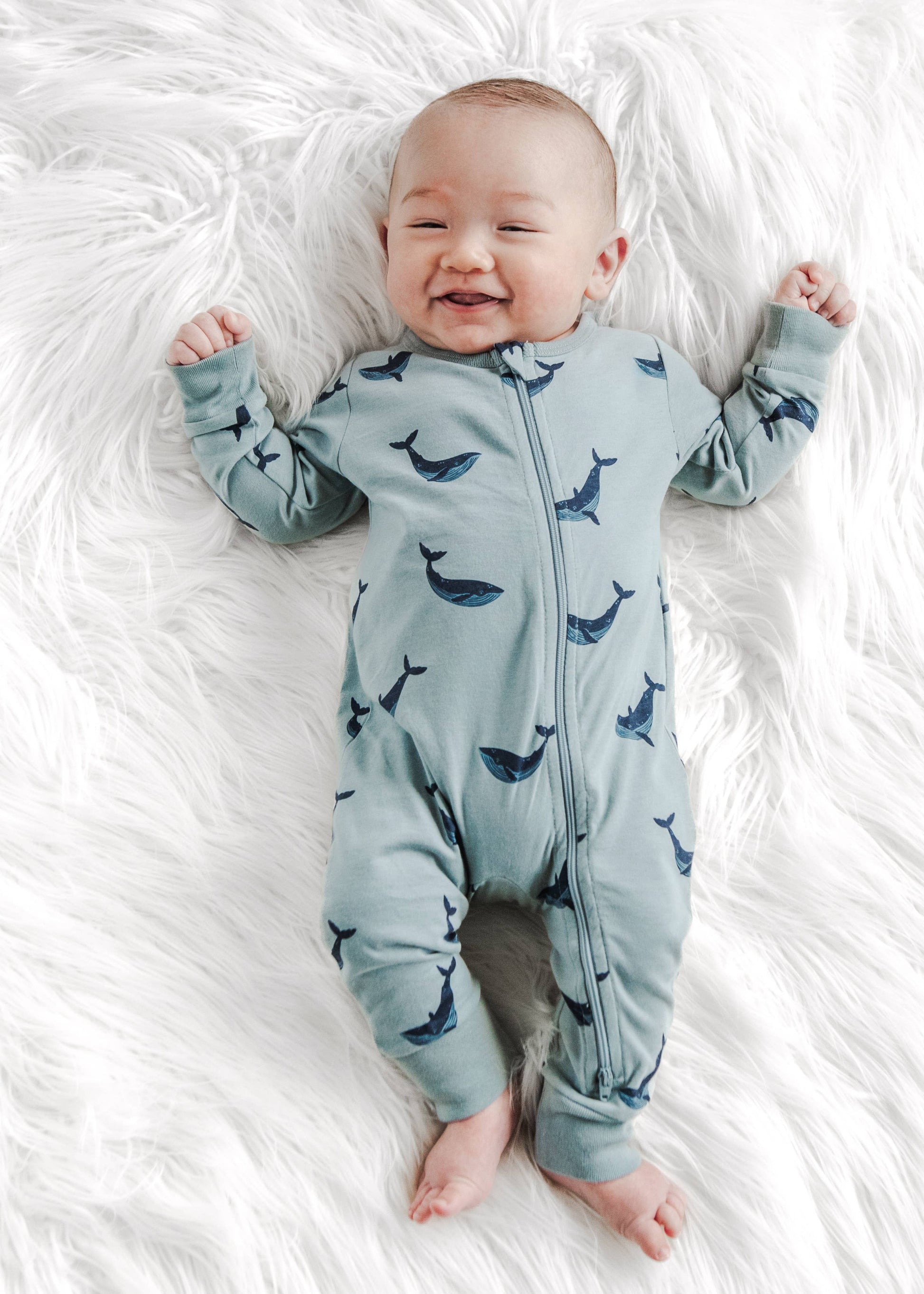 Whether it's playtime adventures or cozy nap sessions, the 100% combed cotton jersey 2-way zip romper with the enchanting blue whale print promises comfort, style, and endless smiles for your precious bundle of joy.